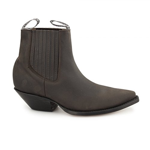 GRINDERS - 'MUSTANG' BROWN COWBOY WESTERN BOOTS The Mustang is a stunning full leather western cowboy ankle boot from Grinders. Oiled leather giving a non shiny look. All leather goodyear welted soles, leather stacked heels,fully leather lined. This plain leather short boot has elasticated sides for ease which is covered in a leather finish.